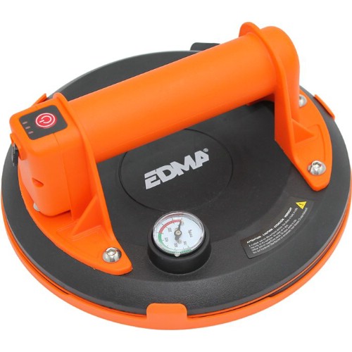 Handhållen vakuumlyft i ABS plast med automatisk batteridriven vakuumpump, och tydlig tryckmätare. Avsedd för att lyfta alla plana ytor som glas, metall, kakel och klinker, betong, gipsskivor, plast, dörrar, fönster etc. Lyfter upp till 130 kg horisontellt och 100 kg vertikalt, på ett snabbt, säkert och bekvämt sätt. Enkel hantering, dubbelklick på On/Off-knappen släpper trycket på lyftplattan för enkel borttagning. Trycket justeras genom hur länge knappen trycks ner. Automatisk på/av-funktion där pumpen stannar när det önskade vakuumtrycket är uppnått (-450 mmHg). Automatisk tryckreglering om vakuumtrycket sjunker under -350 mmHg, pumpen aktiveras tills vakuumtryck -450 mmHg är uppnått igen. Greppvänligt och halkfritt handtag. Försedd med silikonlyftplatta med dubbelläpp. Inbyggt 3,7 V Li-Ion batteri (900 mAh) med nominell effekt på 3 W, laddas med medföljande USB-C laddkabel. Batteritid på ca 8 h, laddas på ca 2 h. LED-batteriindikator. Vikt 0,9 kg. Diameter 198 mm.