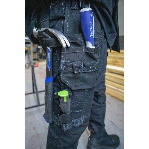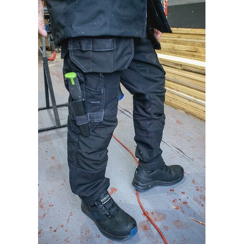 Hantverksbyxa i fullstretch med verktygsfickor. Bitsficka, tumstocksficka, knivknappar, pennfickor på både höger och vänster sida. Bakfickor med extra rymd. Dubbla hammarhankar och dubbla fästpunkter för hammarhållare. D-ring, vänster benficka med dragkedja samt infälld ID-kortsficka som kan döljas. Samtliga fickor förstärkta med polyamid. Reflexdetaljer. Invändiga knäskyddsfickor med möjlighet att justera placering av knäskydd i rätt höjd. Nedfällbar fåll för längre benlängd. Förböjda ben och förstärkt grensöm. Förstärkt med polyamid på utsatta ställen. Tvätt 60°C.